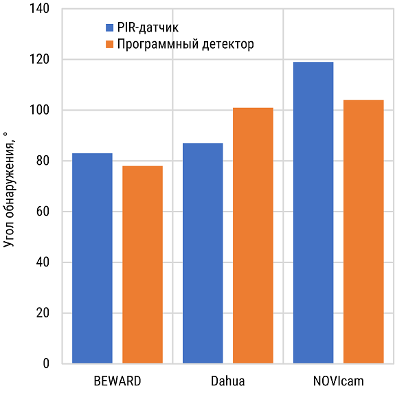 Угол обнаружения PIR-датчика определяется сектором перед камерой, в котором она безошибочно фиксирует движение. Чувствительность программного детектора может быть настроена таким образом, чтобы его угол обнаружения совпал с углом обзора камеры. Поэтому угол обнаружения программного детектора можно считать равным реальному углу обзора камеры. Средние угол обнаружения PIR-сенсоров и угол обзора камер оказались практически равны.