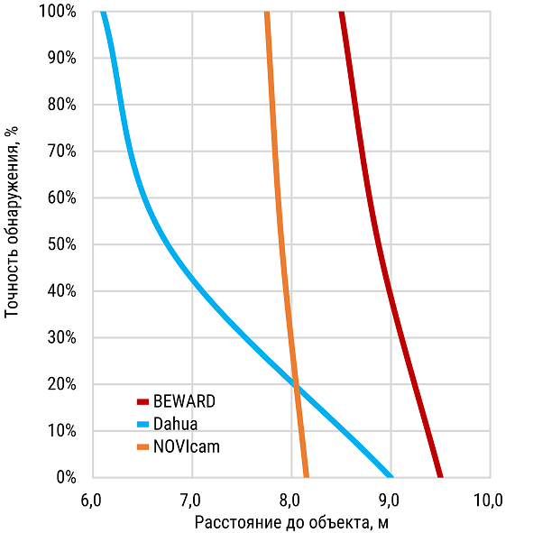 Рисунок 3 Изменение точности обнаружения с увеличением расстояния до объекта при: скорость движения 1,7 м/с; разность температур 4°C (больше-лучше)
