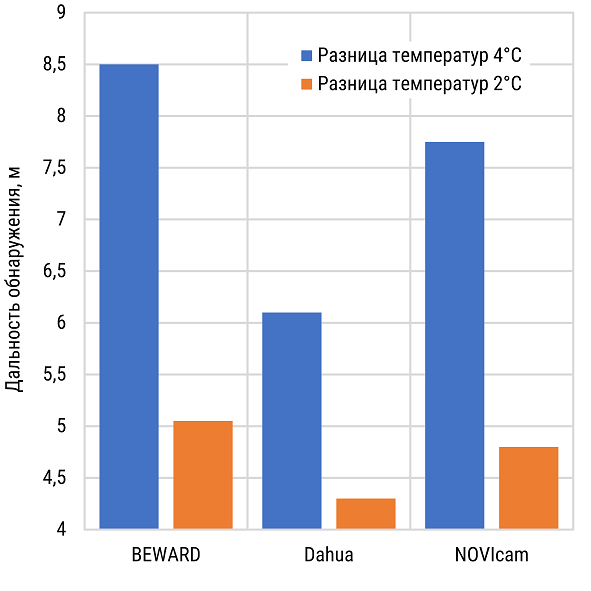 Уменьшение разницы температур между объектом и окружающей средой с 4°C до 2°C приводит к закономерному снижению дальности обнаружения детектора. Но даже при разнице температур всего в 2°C детектор стабильно фиксирует движение. В большинстве случаев человек будет иметь существенно более высокую температуру, чем помещение